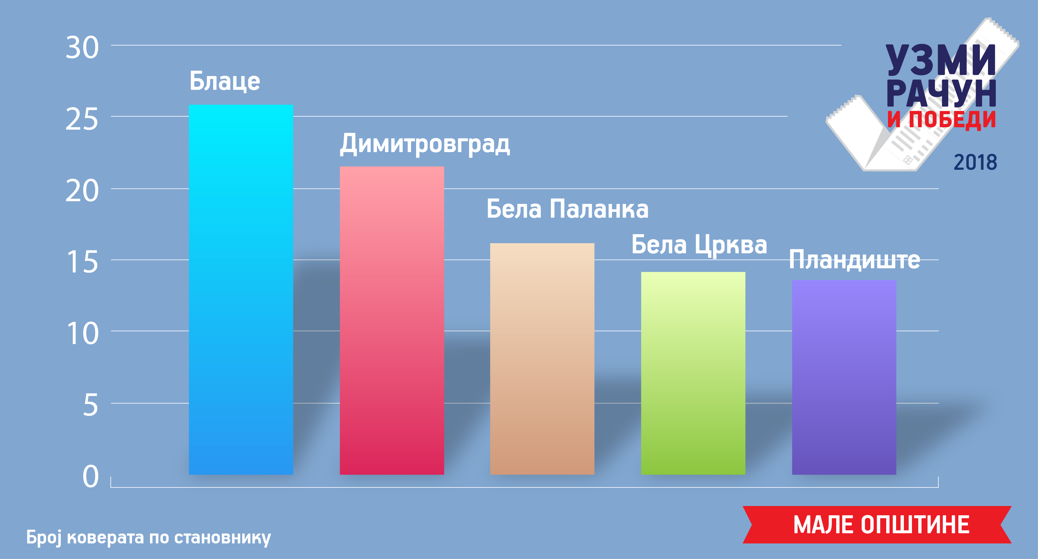 - У категорији малих општина прво место заузела је општина Блаце, а следе је Димитровград и Бела Паланка. Велике шансе за улазак у три најбоље имају Бела Црква и Пландиште, заузимајући четврто, односно пето место.