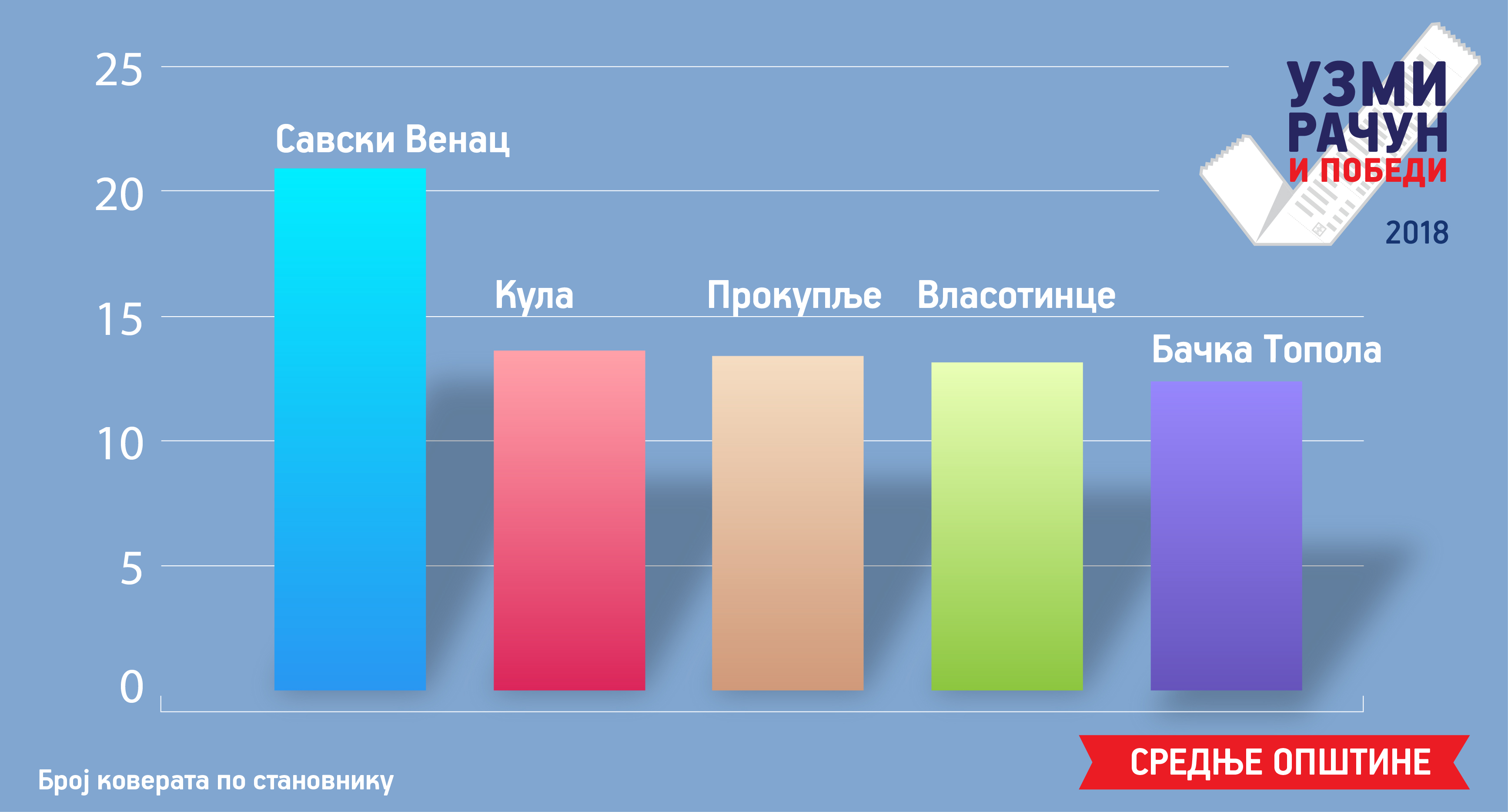 - Водећа у сакупљању рачуна и слипова међу средњим општинама је градска општина Савски венац, друго место заузима Кула, а трећу позицију држи Прокупље. У трци за награду сустижу их Власотинце, Бачка Топола, Врбас и Алубинар.